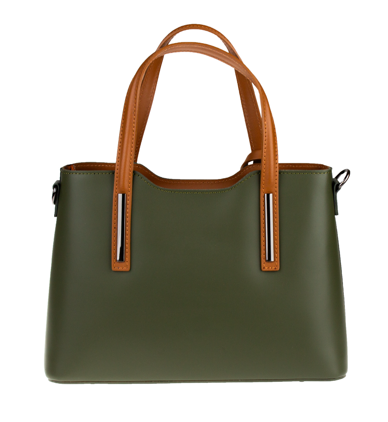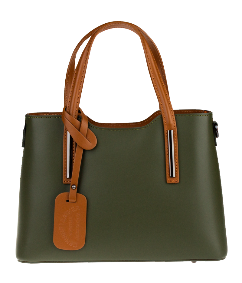 Praktická kabelka v zeleném provedení pro každodenní nošení vyrobená z pevné pravé kůže. Nosí se v ruce nebo na rameni. Kabelka je uzavíratelná na zip. Součástí balení je přídavný popruh – cca 107 cm v plné délce. Uvnitř kabelky najdeme přepážku uprostřed, která zároveň slouží jako kapsa na zip, a na bočních stěnách pak kapsu na zip a 2 malé kapsy vhodné např. pro mobil a peněženku.