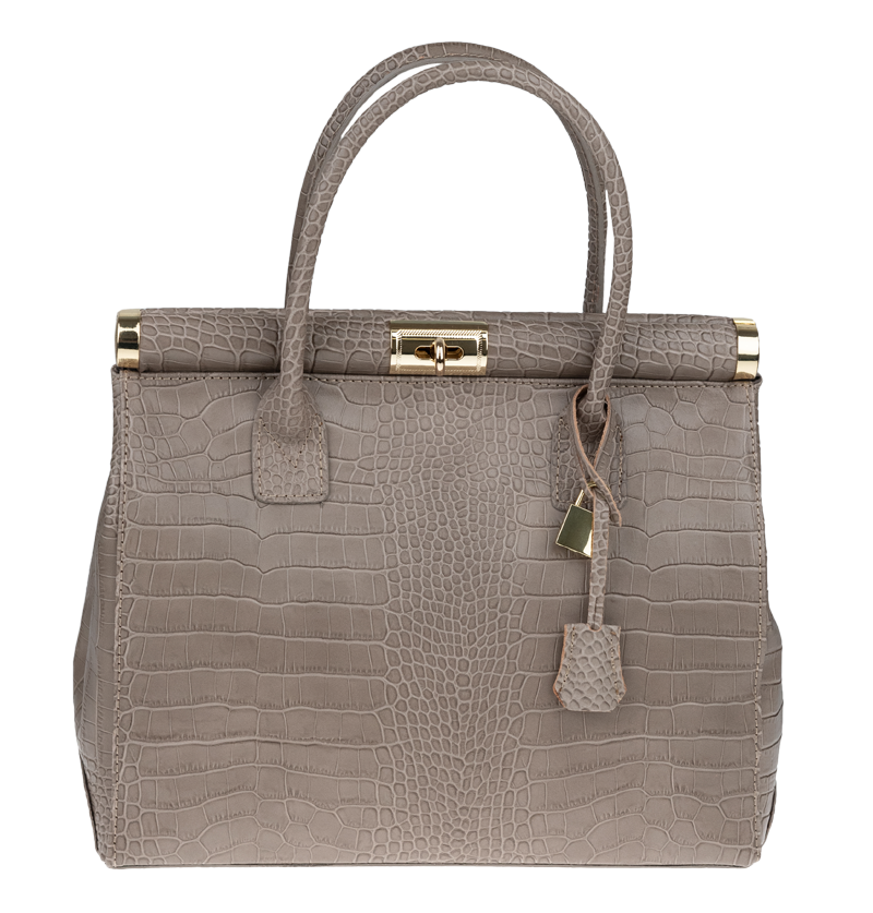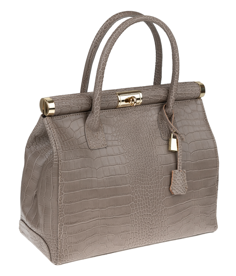 Tato kabelka zvaná též "doktorská" se může pochlubit kromě svého klasického designu tím, že dobře drží tvar. Tato kožená kabelka je nositelná do ruky a uzavíratelná na patentek, který pak v případě potřeby můžete uzamknout přiloženým zámečkem. Jejím materiálem je pravá kůže s úpravou lesklé krokodýlí textury.  Uvnitř najdete kapsu na zip a 2 malé kapsy vhodné např. pro Váš mobil a peněženku a uprostřed je látková přepážka také s kapsou na zip. Kabelka má navíc k tomu všemu kapsu na zip na vnější zadní straně. Hloubka jejího dna je 15 cm.