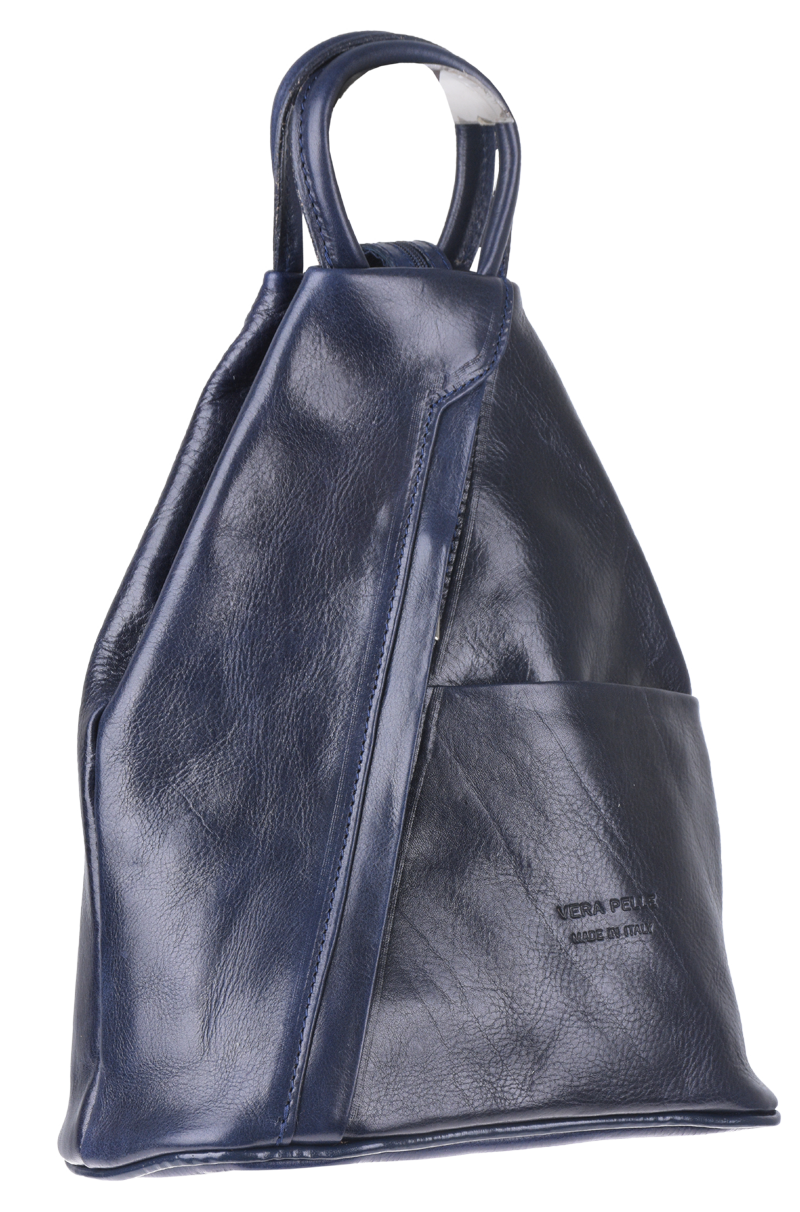 Jedinečný kožený batůžek v modré barvě se zajímavým tvarem. Pěkně ho zdobí nenápadný detail na přední straně. Batůžek se otvírá zboku na zip. Velmi zajímavé jsou popruhy batohu, které se rozepínají na zip, čímž si můžete libovolně upravit způsob nošení batůžku.