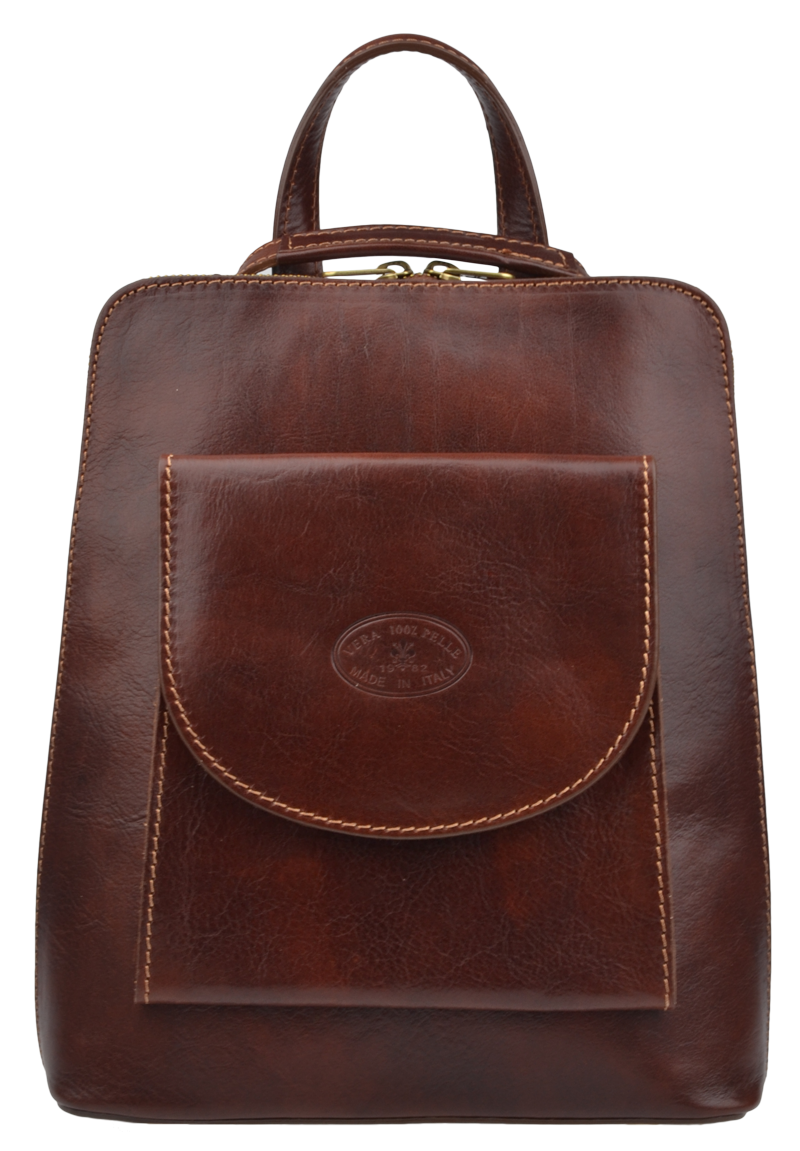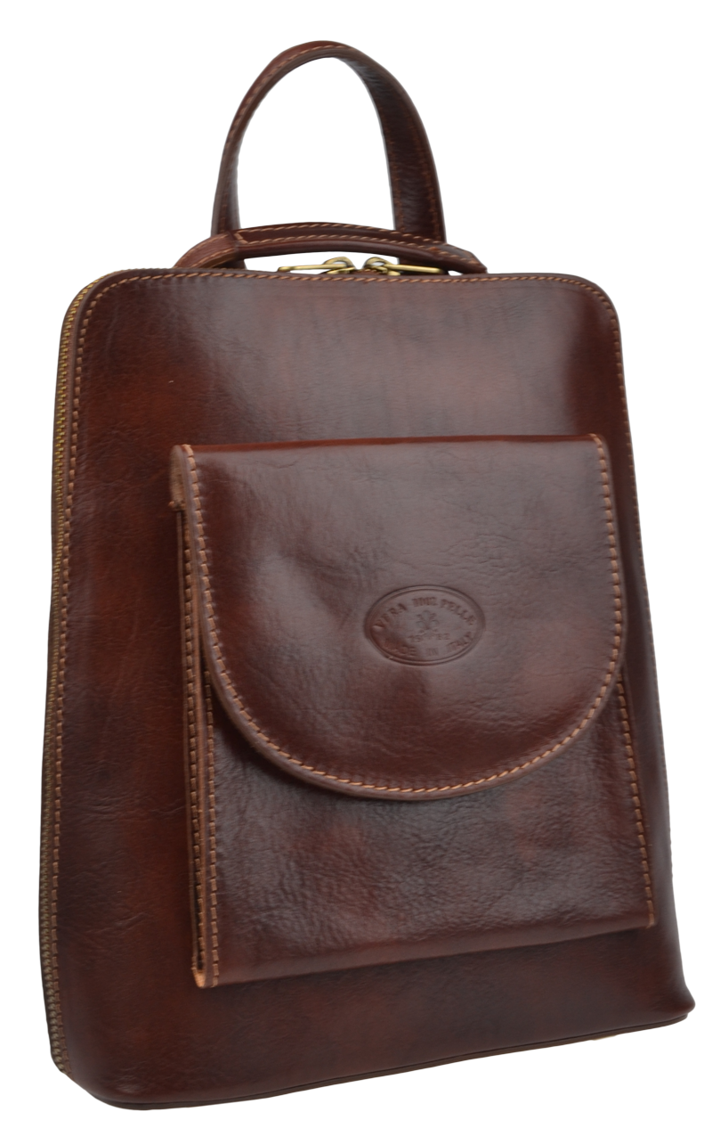 Hnědý kožený batůžek, se zlatými kovovými doplňky a zipy.