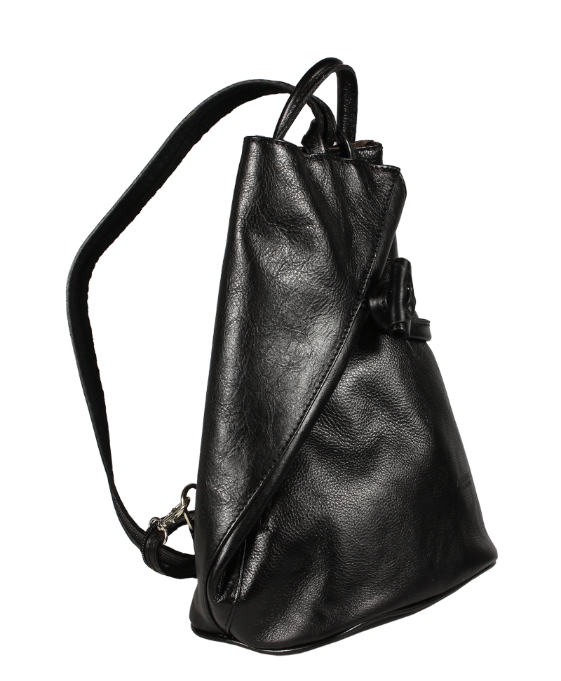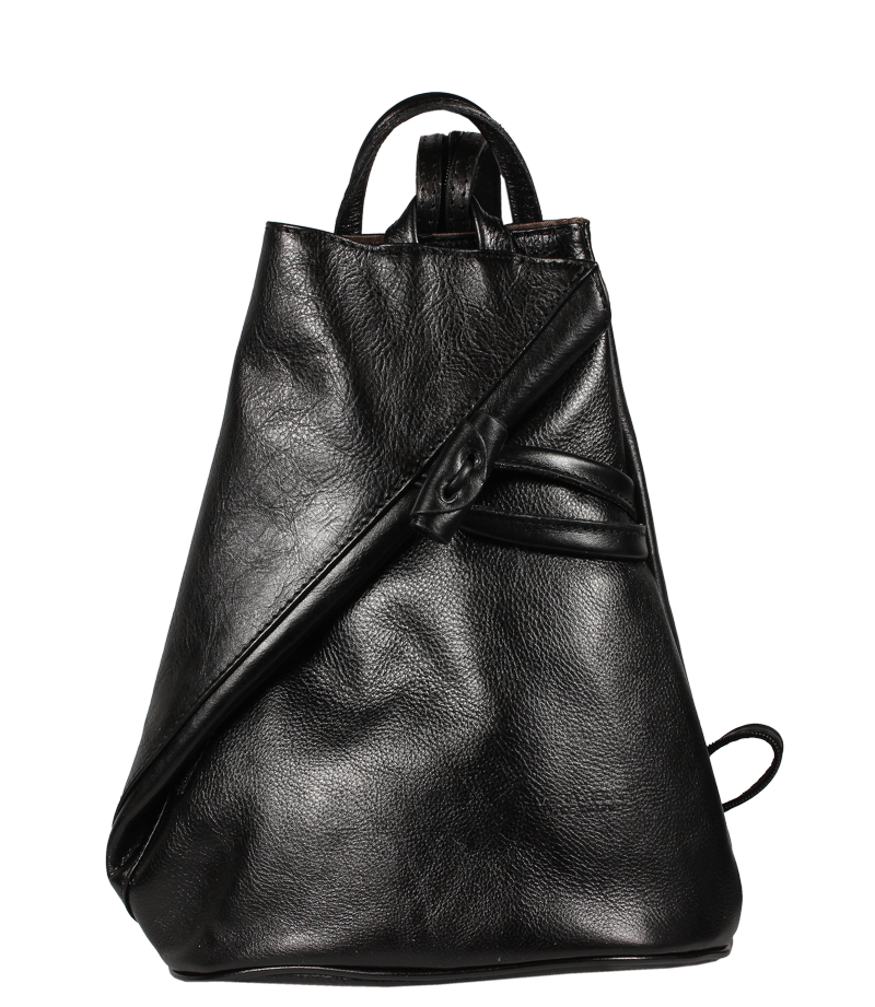 Jedinečný kožený batůžek se zajímavým tvarem. Dominantním prvkem kabelky je její zapínání na kožený knoflík. Zvenku u uvnitř kabelky můžete využít malé zapínací kapsy na zip pro Váš mobil či klíče. Velmi zajímavé je provedení popruhů batůžku, popruhy lze upravit zipem a tím si můžete určit způsob nošení batůžku.
