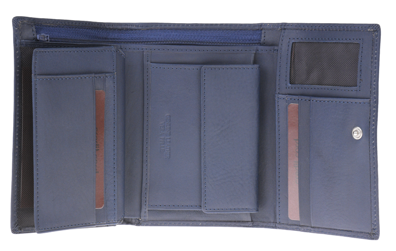Elegantní dámská peněženka moderního designu v modré barvě z matné kůže. Tato kožená peněženka mírně obdélníkového tvaru se zavírá na patentek (cvoček). Je velice praktická s nabídkou kapes: na mince, na bankovky, hned vedle kapsa na zip, dále celkem 5 kapes např. na doklady a 6 na platební a jiné karty. Peněženka je moderní a určená pro všestranné použití.