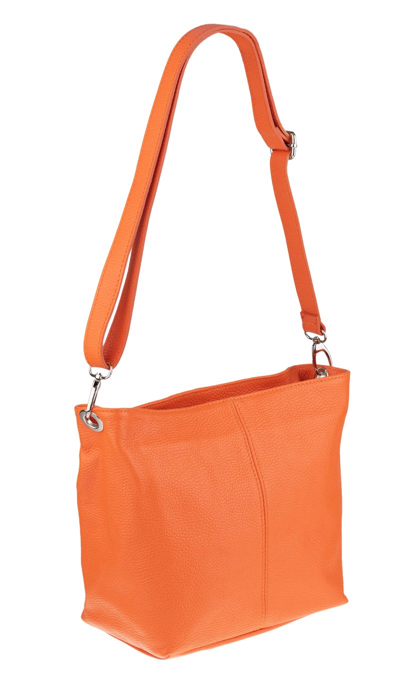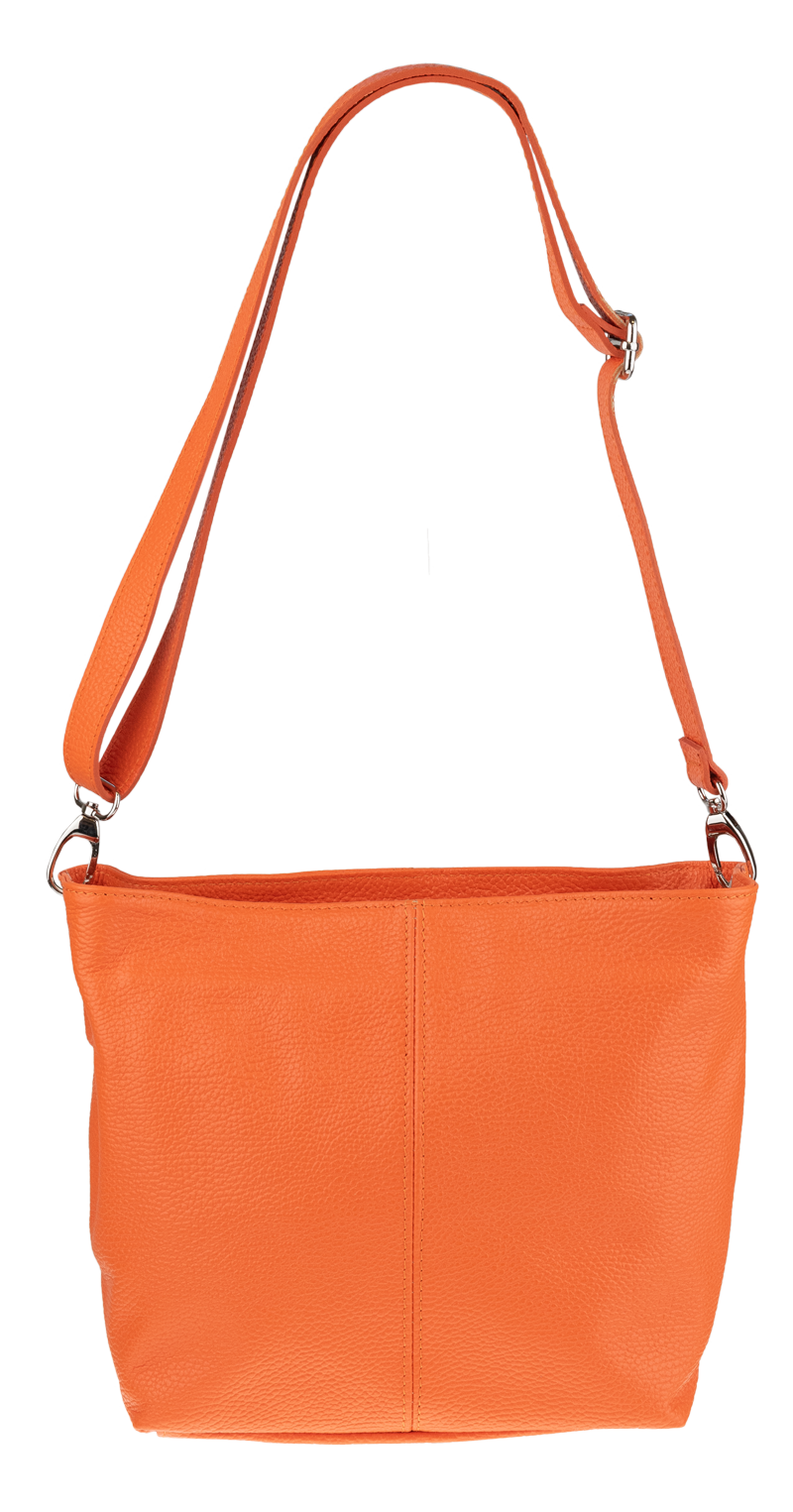 Oranžová kabelka nositelná přes rameno či cross-body (křížem). Tato kožená kabelka je uzavíratelná na zip. Uvnitř kabelky najdeme přepážku uprostřed, která zároveň slouží jako kapsa na zip, a na boční stěně pak kapsu na zip. Hloubka jejího dna je 13 cm. Kabelka má navíc nastavitelný popruh s maximální délkou cca 120 cm.