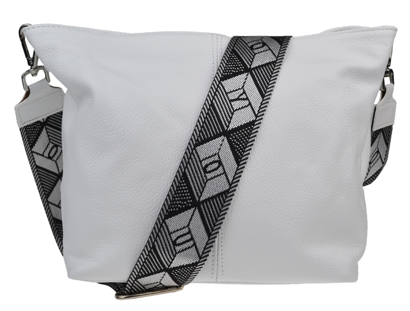 Bílá kabelka nositelná přes rameno či cross-body (křížem). Tato kožená kabelka je uzavíratelná na zip. Uvnitř kabelky najdeme přepážku uprostřed, která zároveň slouží jako kapsa na zip, a na boční stěně pak kapsu na zip. Hloubka jejího dna je 13 cm.