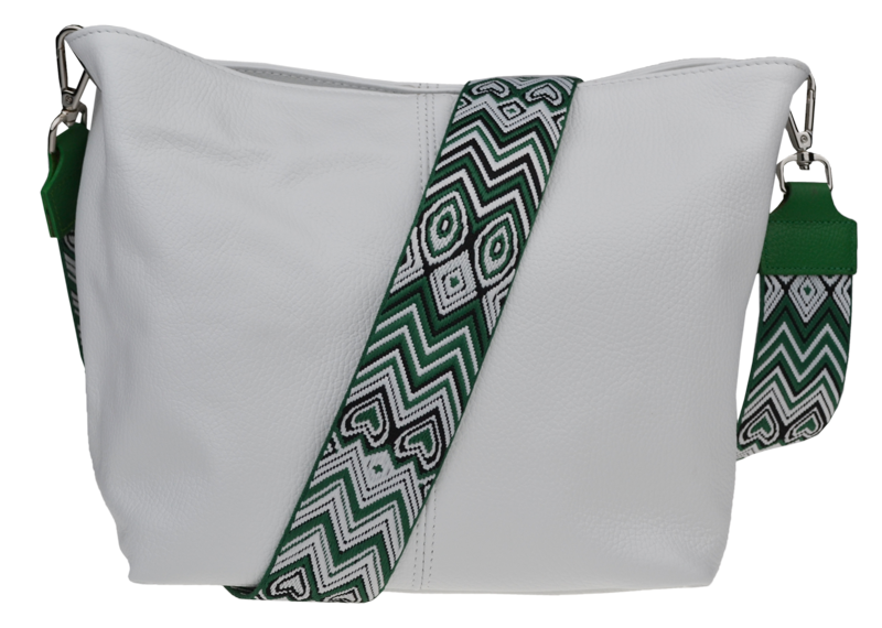 Bílá kabelka nositelná přes rameno či cross-body (křížem). Tato kožená kabelka je uzavíratelná na zip. Uvnitř kabelky najdeme přepážku uprostřed, která zároveň slouží jako kapsa na zip, a na boční stěně pak kapsu na zip. Hloubka jejího dna je 13 cm.