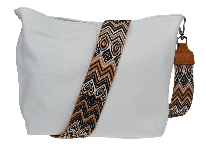 Bílá kabelka nositelná přes rameno či cross-body (křížem). Tato kožená kabelka je uzavíratelná na zip. Uvnitř kabelky najdeme přepážku uprostřed, která zároveň slouží jako kapsa na zip, a na boční stěně pak kapsu na zip. Hloubka jejího dna je 13 cm.