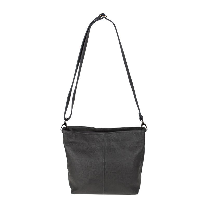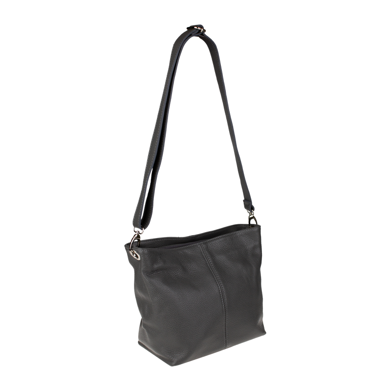 Šedá kabelka nositelná přes rameno či cross-body (křížem). Tato kožená kabelka je uzavíratelná na zip. Uvnitř kabelky najdeme přepážku uprostřed, která zároveň slouží jako kapsa na zip, a na boční stěně pak kapsu na zip. Hloubka jejího dna je 13 cm. Kabelka má navíc nastavitelný popruh s maximální délkou cca 120 cm.