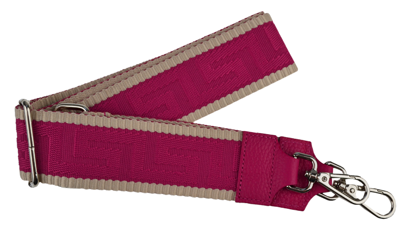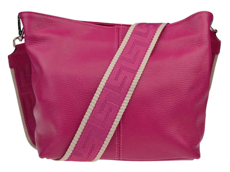 Růžová kabelka nositelná přes rameno či cross-body (křížem). Tato kožená kabelka je uzavíratelná na zip. Uvnitř kabelky najdeme přepážku uprostřed, která zároveň slouží jako kapsa na zip, a na boční stěně pak kapsu na zip. Hloubka jejího dna je 13 cm.