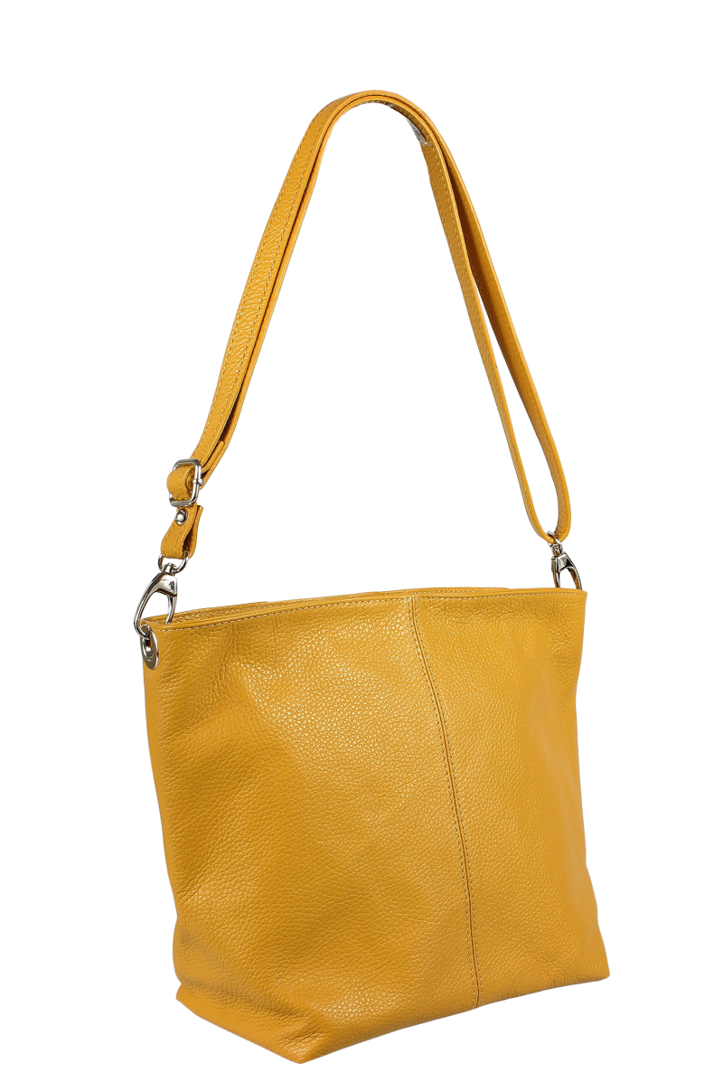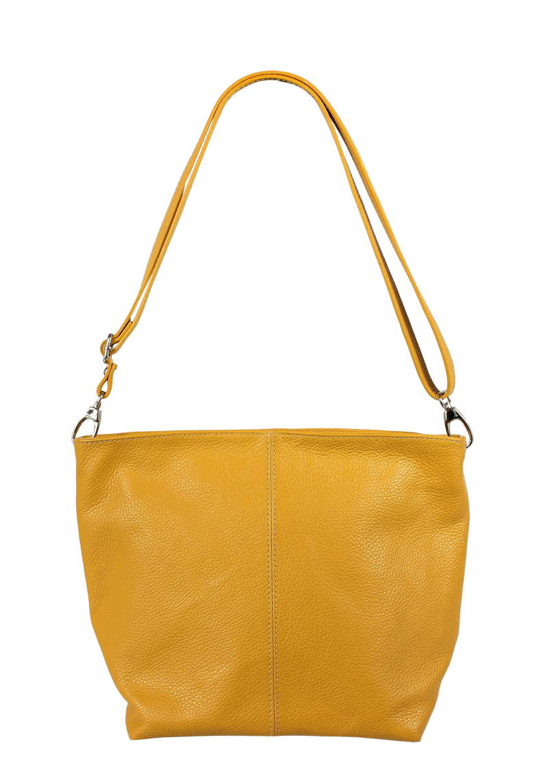 Žlutá kabelka nositelná přes rameno či cross-body (křížem). Tato kožená kabelka je uzavíratelná na zip. Uvnitř kabelky najdeme přepážku uprostřed, která zároveň slouží jako kapsa na zip, a na boční stěně pak kapsu na zip. Hloubka jejího dna je 13 cm. Kabelka má navíc nastavitelný popruh s maximální délkou cca 120 cm.