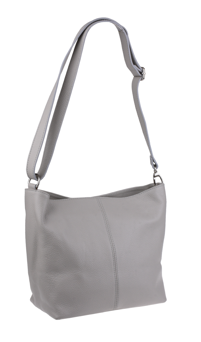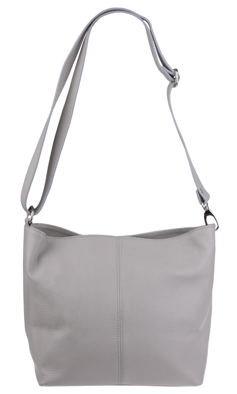 Šedá kabelka nositelná přes rameno či cross-body (křížem). Tato kožená kabelka je uzavíratelná na zip. Uvnitř kabelky najdeme přepážku uprostřed, která zároveň slouží jako kapsa na zip, a na boční stěně pak kapsu na zip. Hloubka jejího dna je 13 cm. Kabelka má navíc nastavitelný popruh s maximální délkou cca 120 cm.