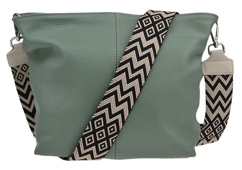 Zelená kabelka nositelná přes rameno či cross-body (křížem). Tato kožená kabelka je uzavíratelná na zip. Uvnitř kabelky najdeme přepážku uprostřed, která zároveň slouží jako kapsa na zip, a na boční stěně pak kapsu na zip. Hloubka jejího dna je 13 cm.