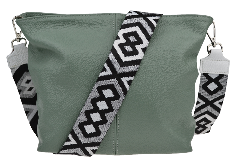 Zelená kabelka nositelná přes rameno či cross-body (křížem). Tato kožená kabelka je uzavíratelná na zip. Uvnitř kabelky najdeme přepážku uprostřed, která zároveň slouží jako kapsa na zip, a na boční stěně pak kapsu na zip. Hloubka jejího dna je 13 cm.