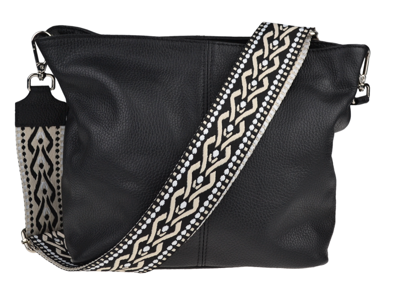 Černá kabelka nositelná přes rameno či cross-body (křížem). Tato kožená kabelka je uzavíratelná na zip. Uvnitř kabelky najdeme přepážku uprostřed, která zároveň slouží jako kapsa na zip, a na boční stěně pak kapsu na zip. Hloubka jejího dna je 13 cm. Kabelka má navíc nastavitelný popruh s maximální délkou cca 120 cm.