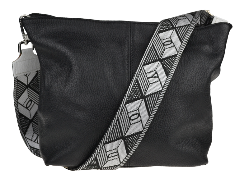 Černá kabelka nositelná přes rameno či cross-body (křížem). Tato kožená kabelka je uzavíratelná na zip. Uvnitř kabelky najdeme přepážku uprostřed, která zároveň slouží jako kapsa na zip, a na boční stěně pak kapsu na zip. Hloubka jejího dna je 13 cm. Kabelka má navíc nastavitelný popruh s maximální délkou cca 120 cm.