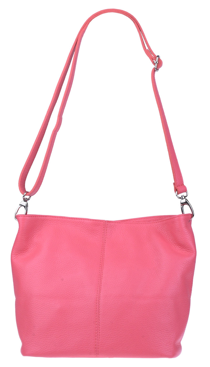 Růžová kabelka nositelná přes rameno či cross-body (křížem). Tato kožená kabelka je uzavíratelná na zip. Uvnitř kabelky najdeme přepážku uprostřed, která zároveň slouží jako kapsa na zip, a na boční stěně pak kapsu na zip. Hloubka jejího dna je 13 cm. Kabelka má navíc nastavitelný popruh s maximální délkou cca 120 cm.