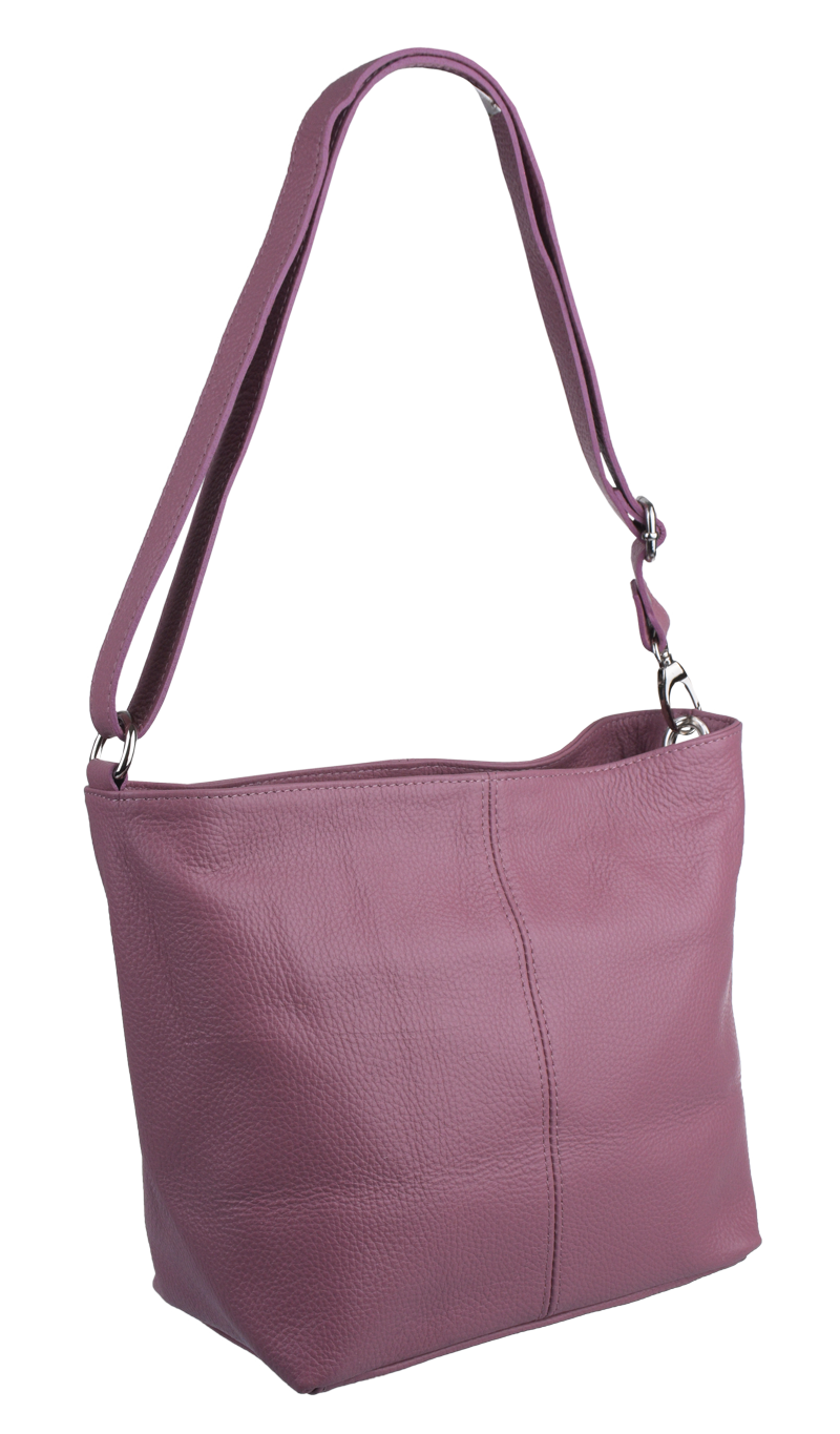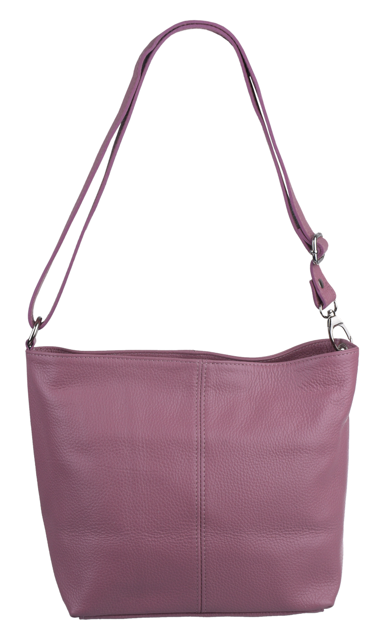 Růžová kabelka nositelná přes rameno či cross-body (křížem). Tato kožená kabelka je uzavíratelná na zip. Uvnitř kabelky najdeme přepážku uprostřed, která zároveň slouží jako kapsa na zip, a na boční stěně pak kapsu na zip. Hloubka jejího dna je 13 cm. Kabelka má navíc nastavitelný popruh s maximální délkou cca 120 cm.