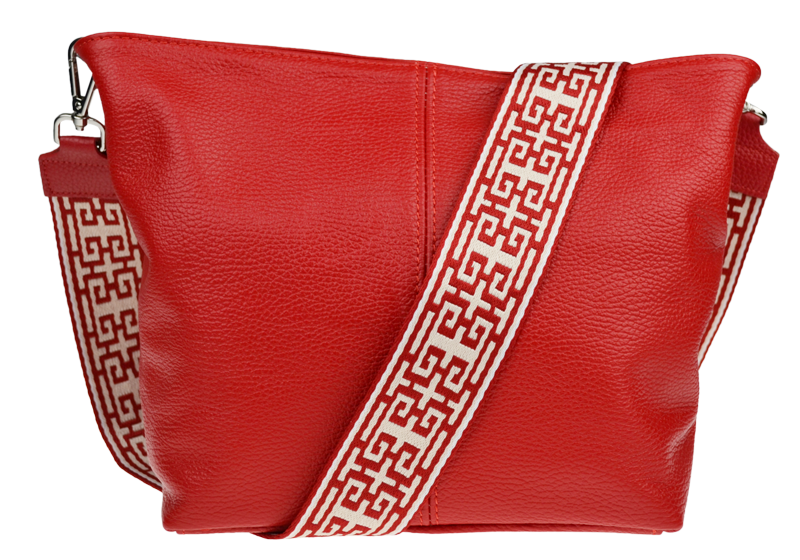 Červená kabelka nositelná přes rameno či cross-body (křížem). Tato kožená kabelka je uzavíratelná na zip. Uvnitř kabelky najdeme přepážku uprostřed, která zároveň slouží jako kapsa na zip, a na boční stěně pak kapsu na zip. Hloubka jejího dna je 13 cm.