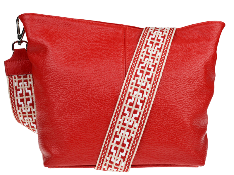 Červená kabelka nositelná přes rameno či cross-body (křížem). Tato kožená kabelka je uzavíratelná na zip. Uvnitř kabelky najdeme přepážku uprostřed, která zároveň slouží jako kapsa na zip, a na boční stěně pak kapsu na zip. Hloubka jejího dna je 13 cm.