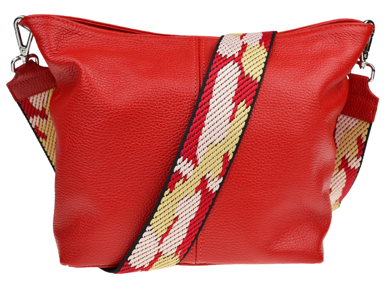 Červená kabelka nositelná přes rameno či cross-body (křížem). Tato kožená kabelka je uzavíratelná na zip. Uvnitř kabelky najdeme přepážku uprostřed, která zároveň slouží jako kapsa na zip, a na boční stěně pak kapsu na zip. Hloubka jejího dna je 13 cm.