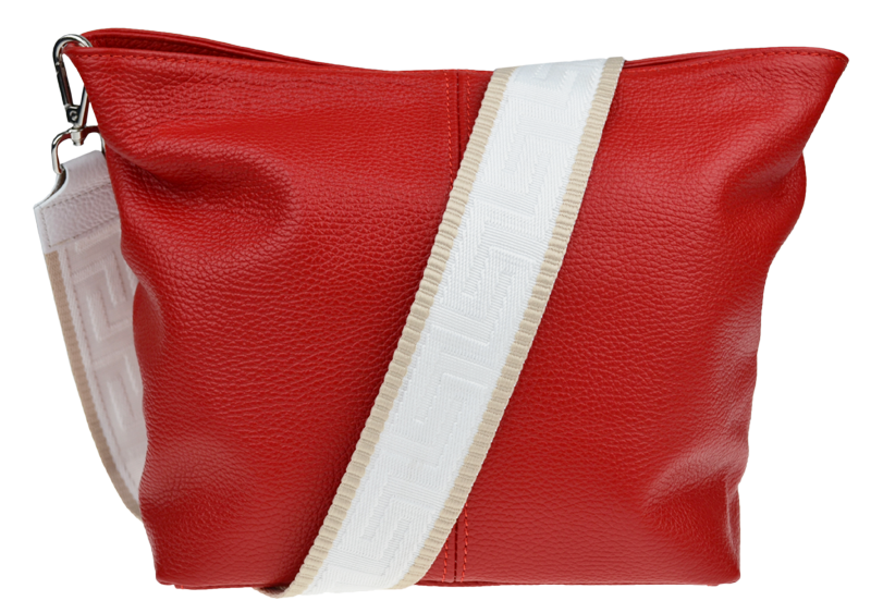 Červená kabelka nositelná přes rameno či cross-body (křížem). Tato kožená kabelka je uzavíratelná na zip. Uvnitř kabelky najdeme přepážku uprostřed, která zároveň slouží jako kapsa na zip, a na boční stěně pak kapsu na zip. Hloubka jejího dna je 13 cm.