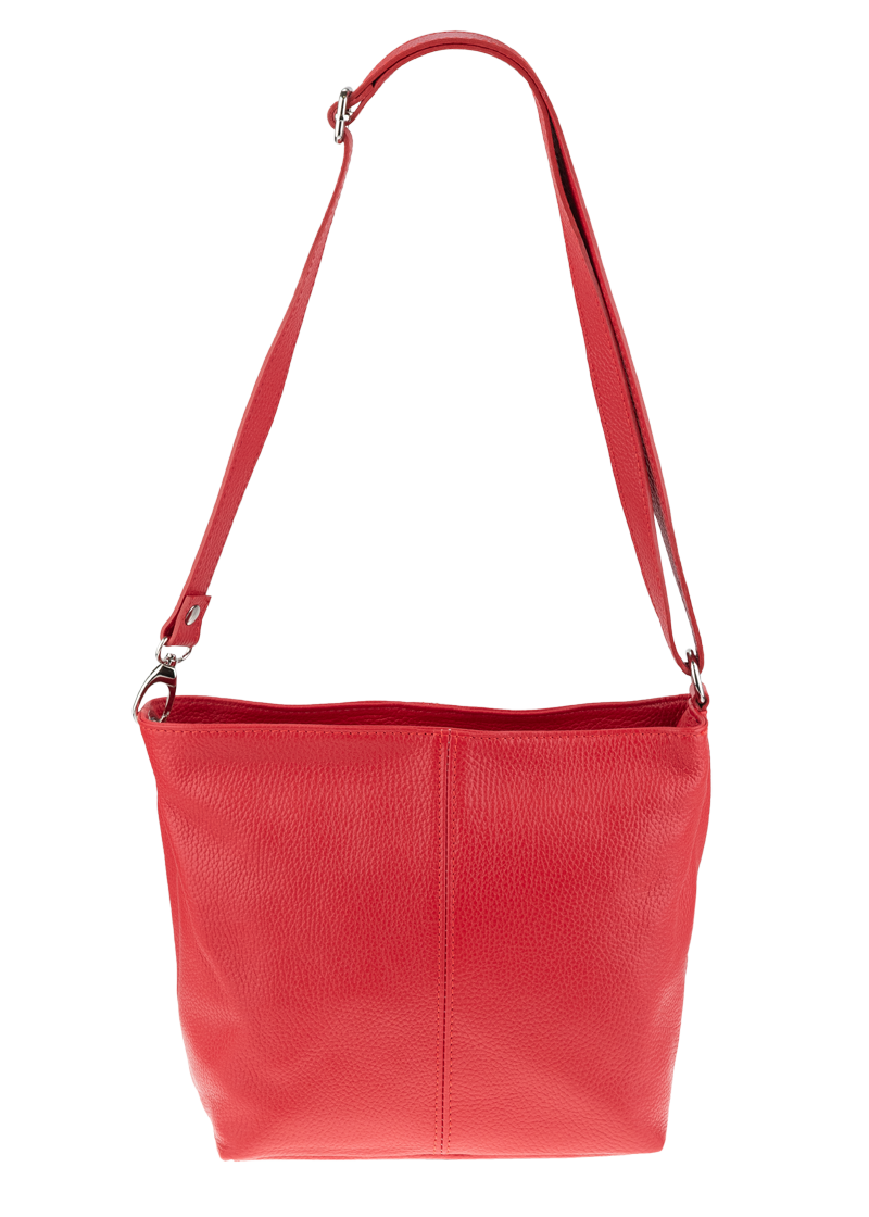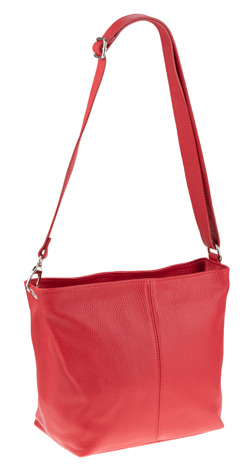 Červená kabelka nositelná přes rameno či cross-body (křížem). Tato kožená kabelka je uzavíratelná na zip. Uvnitř kabelky najdeme přepážku uprostřed, která zároveň slouží jako kapsa na zip, a na boční stěně pak kapsu na zip. Hloubka jejího dna je 13 cm. Kabelka má navíc nastavitelný popruh s maximální délkou cca 120 cm.