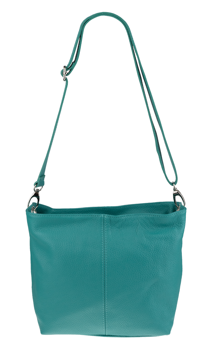 Tyrkysová kabelka nositelná přes rameno či cross-body (křížem). Tato kožená kabelka je uzavíratelná na zip. Uvnitř kabelky najdeme přepážku uprostřed, která zároveň slouží jako kapsa na zip, a na boční stěně pak kapsu na zip. Hloubka jejího dna je 13 cm. Kabelka má navíc nastavitelný popruh s maximální délkou cca 120 cm.