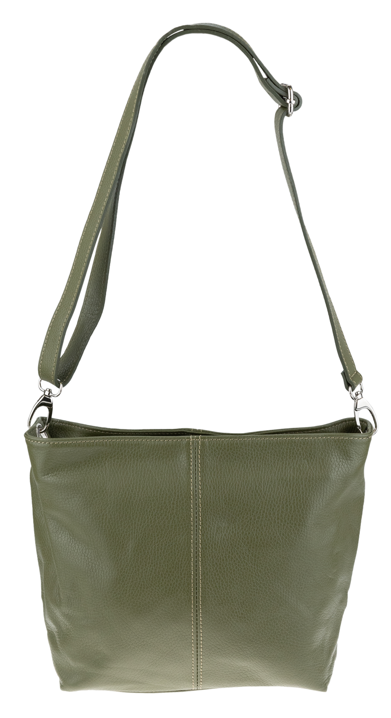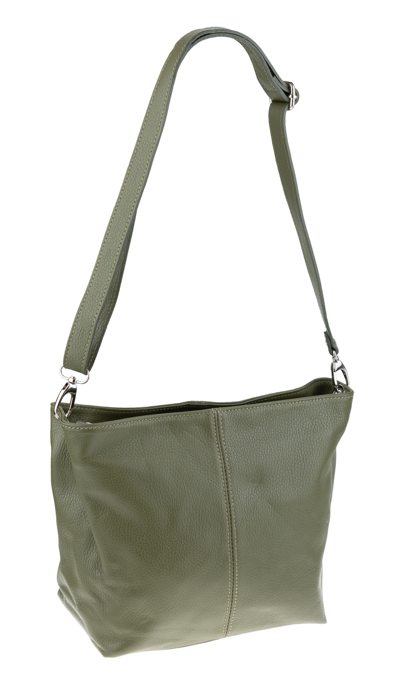 Zelená kabelka nositelná přes rameno či cross-body (křížem). Tato kožená kabelka je uzavíratelná na zip. Uvnitř kabelky najdeme přepážku uprostřed, která zároveň slouží jako kapsa na zip, a na boční stěně pak kapsu na zip. Hloubka jejího dna je 13 cm. Kabelka má navíc nastavitelný popruh s maximální délkou cca 120 cm.