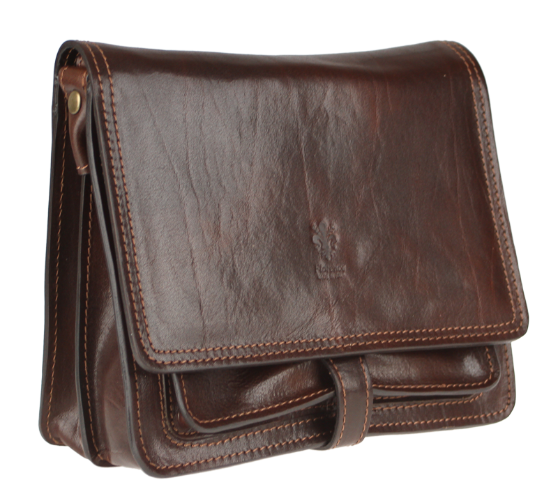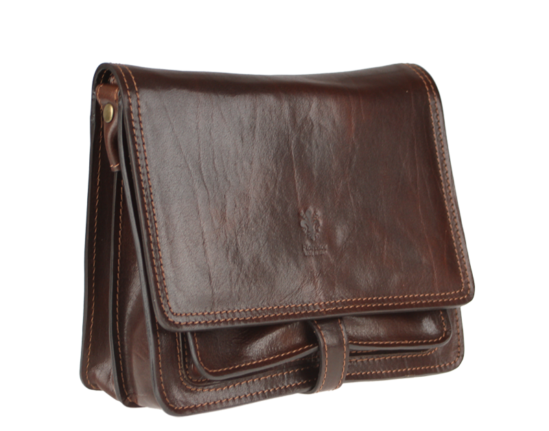 Kožená kabelka v cafe barvě. Kabelka se uzavírá pomocí poklopu na patentky. Uvnitř kabelky jsou tři přihrádky. Délka popruhu je 130 cm.