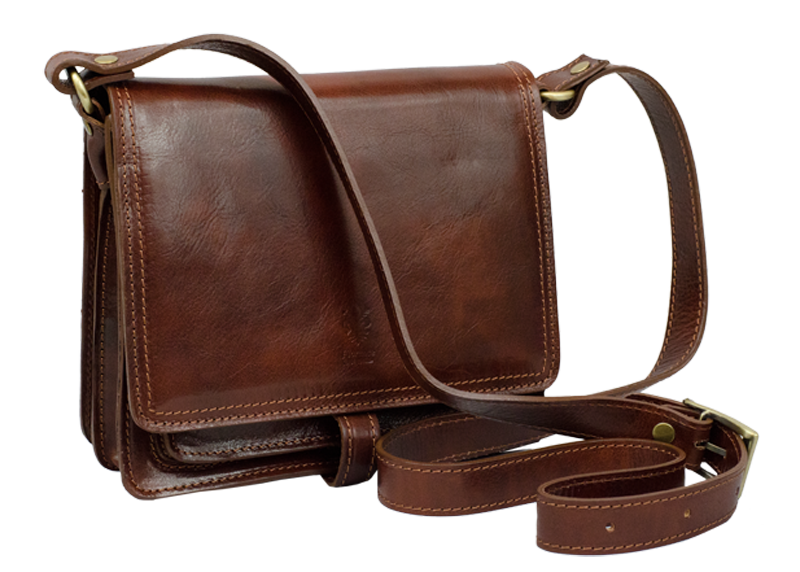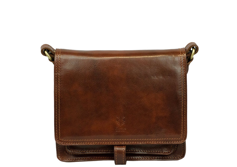 Kožená kabelka v hnědé barvě. Kabelka se uzavírá pomocí poklopu na patentky. Uvnitř kabelky jsou tři přihrádky. Délka popruhu je 130 cm.