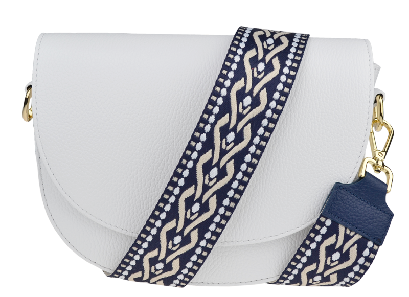 Bílá kabelka nositelná přes rameno či cross-body (křížem). Tato kožená kabelka je uzavíratelná na patentku a uvnitř nalezneme přihrádku na zip.