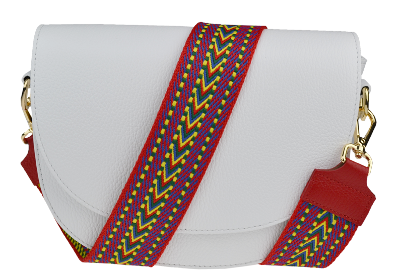 Bílá kabelka nositelná přes rameno či cross-body (křížem). Tato kožená kabelka je uzavíratelná na patentku a uvnitř nalezneme přihrádku na zip.