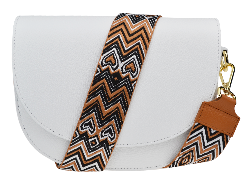Bílá kabelka nositelná přes rameno či cross-body (křížem). Tato kožená kabelka je uzavíratelná na patentku a uvnitř nalezneme přihrádku na zip.