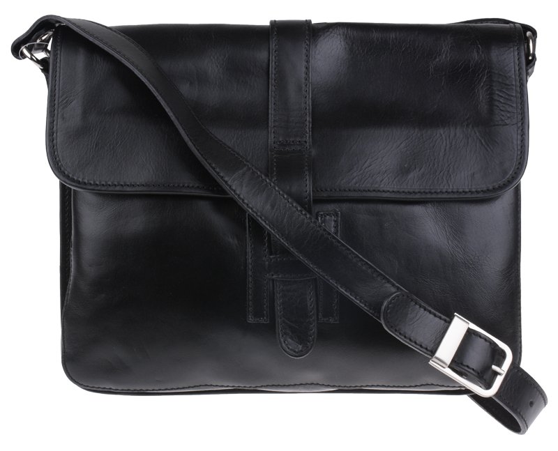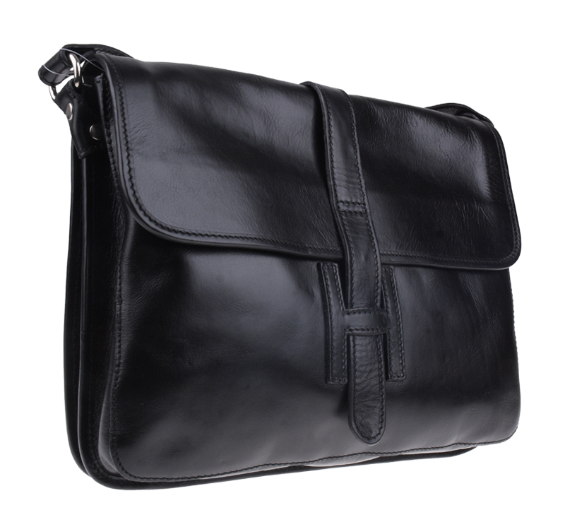 Nádherná kožená vintage kabelka v černé barvě s jedinečným nápaditým zapínáním. Vnitřek kabelky je rozdělen na dvě části a disponuje malou kapsou na zip a koženými doplňky na uchycení psacích potřeb.