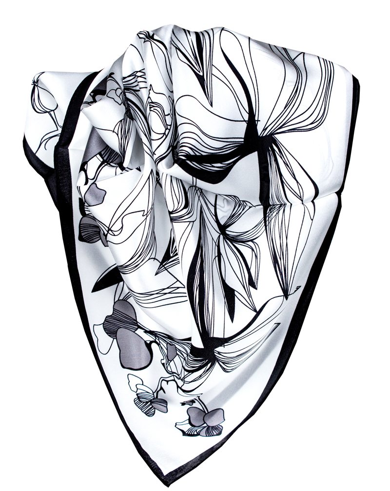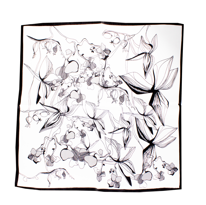 Malý elegantní šátek ze 100% hedvábí s jedinečným vzorem.