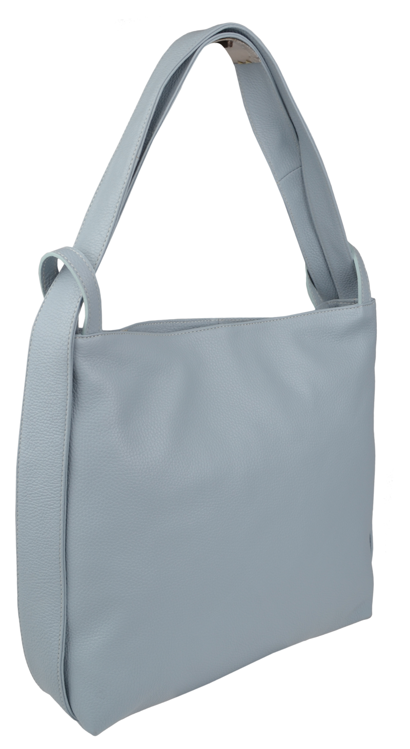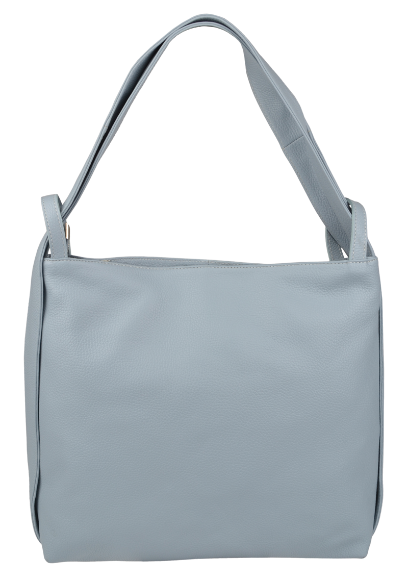 Krásná kožená kabelka s jednoduchým designem v modré barvě. Tato kožená kabelka je uzavíratelná pomocí zipu. Disponuje pohodlnými uchy dostatečné délky, takže jí lze nosit  pohodlně přes rameno nebo jako batůžek. Pohodlně se do ní vejdou dokumenty formátu A4.