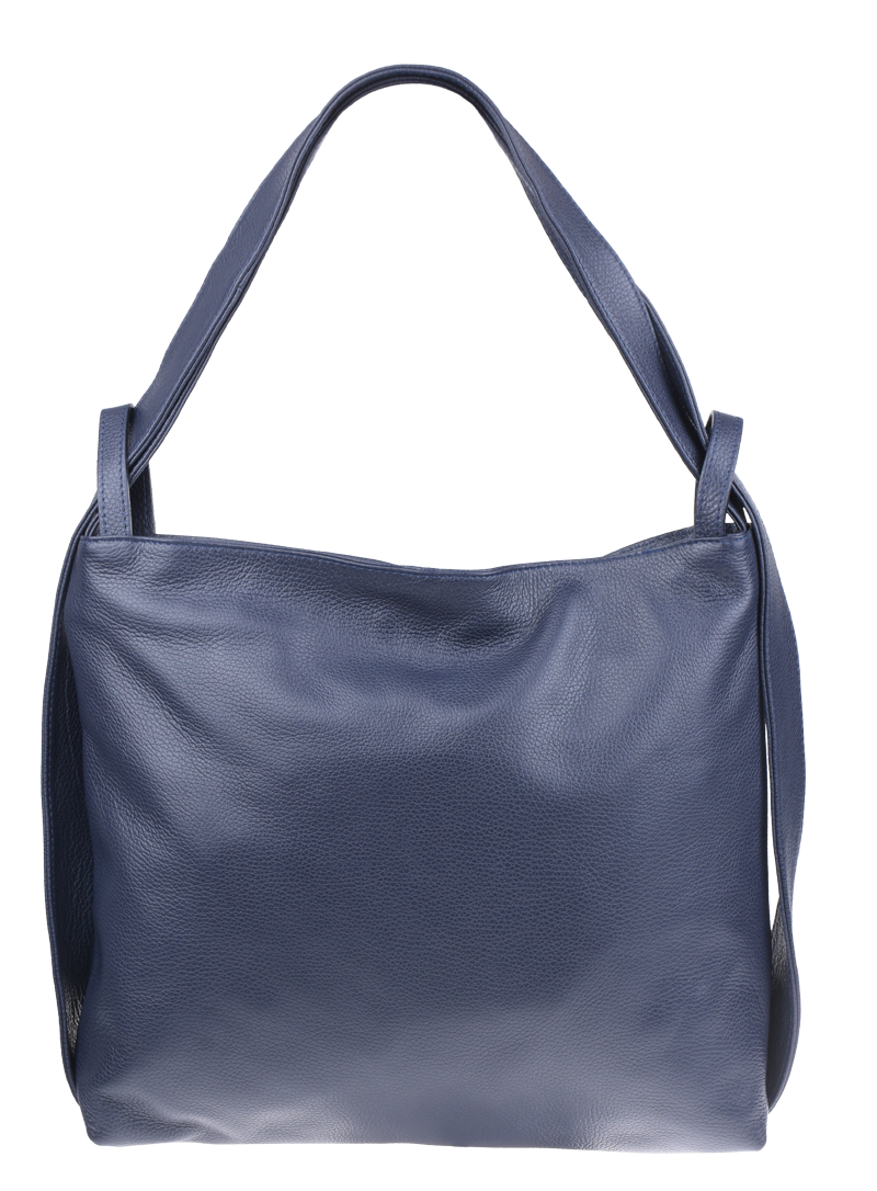 Krásná kožená kabelka s jednoduchým designem v modré barvě. Tato kožená kabelka je uzavíratelná pomocí zipu. Disponuje pohodlnými uchy dostatečné délky, takže jí lze nosit  pohodlně přes rameno nebo jako batůžek.  Pohodlně se do ní vejdou dokumenty formátu A4.