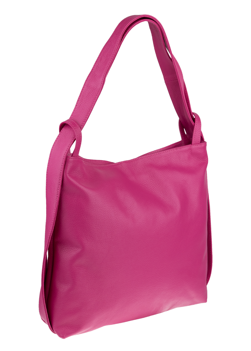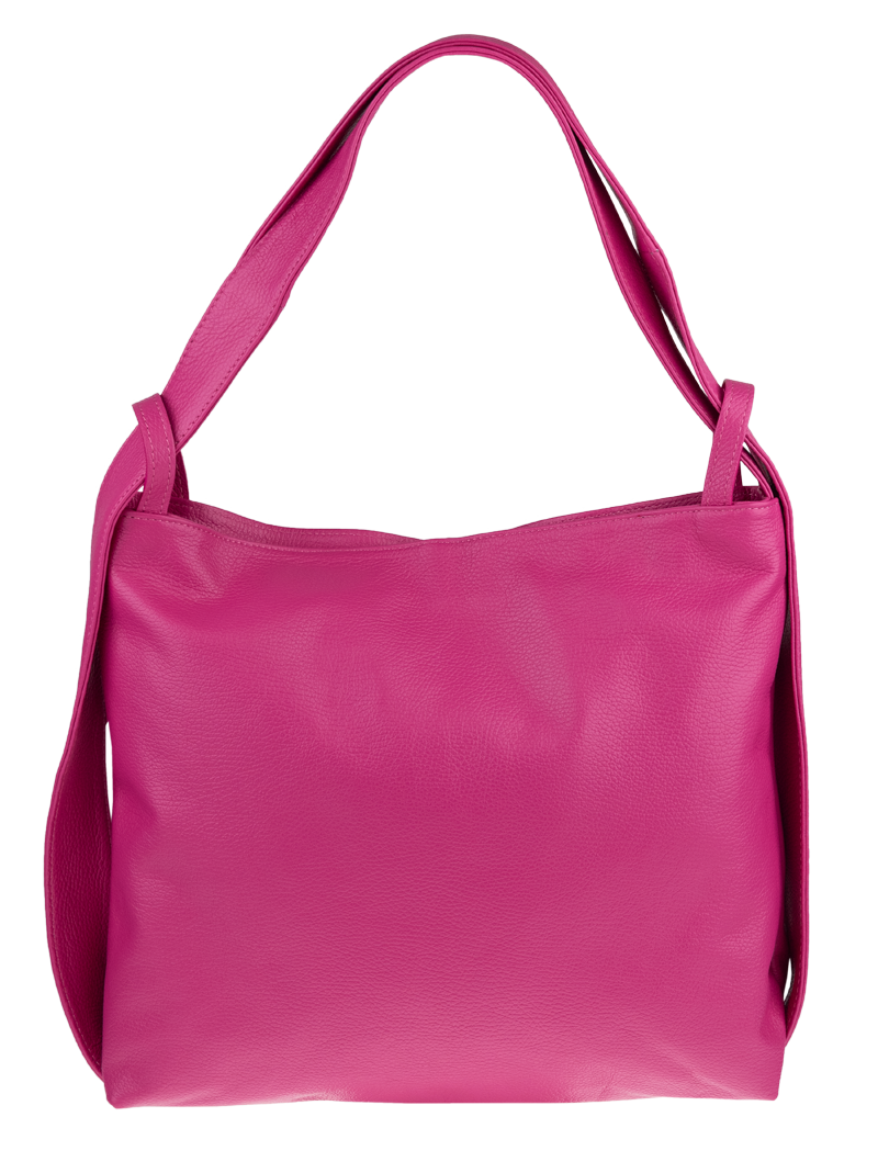 Krásná kožená kabelka s jednoduchým designem v růžové barvě. Tato kožená kabelka je uzavíratelná pomocí zipu. Disponuje pohodlnými uchy dostatečné délky, takže jí lze nosit  pohodlně přes rameno nebo jako batůžek. Pohodlně se do ní vejdou dokumenty formátu A4.