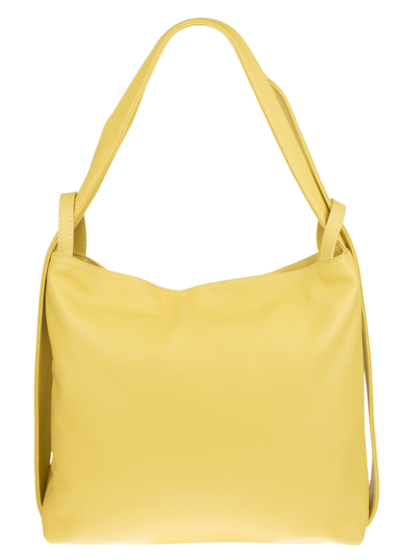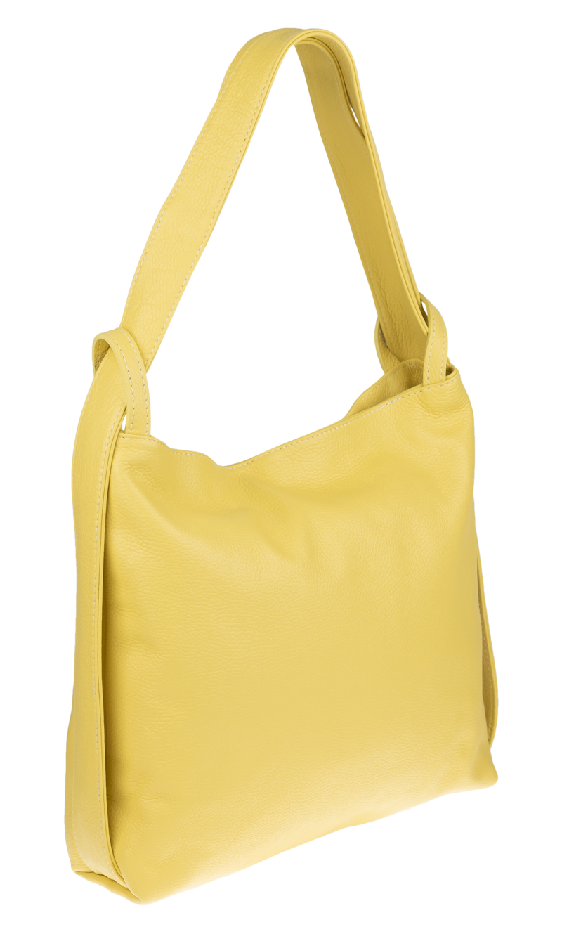 Krásná kožená kabelka s jednoduchým designem ve žluté barvě. Tato kožená kabelka je uzavíratelná pomocí zipu. Disponuje pohodlnými uchy dostatečné délky, takže jí lze nosit  pohodlně přes rameno nebo jako batůžek. Pohodlně se do ní vejdou dokumenty formátu A4.