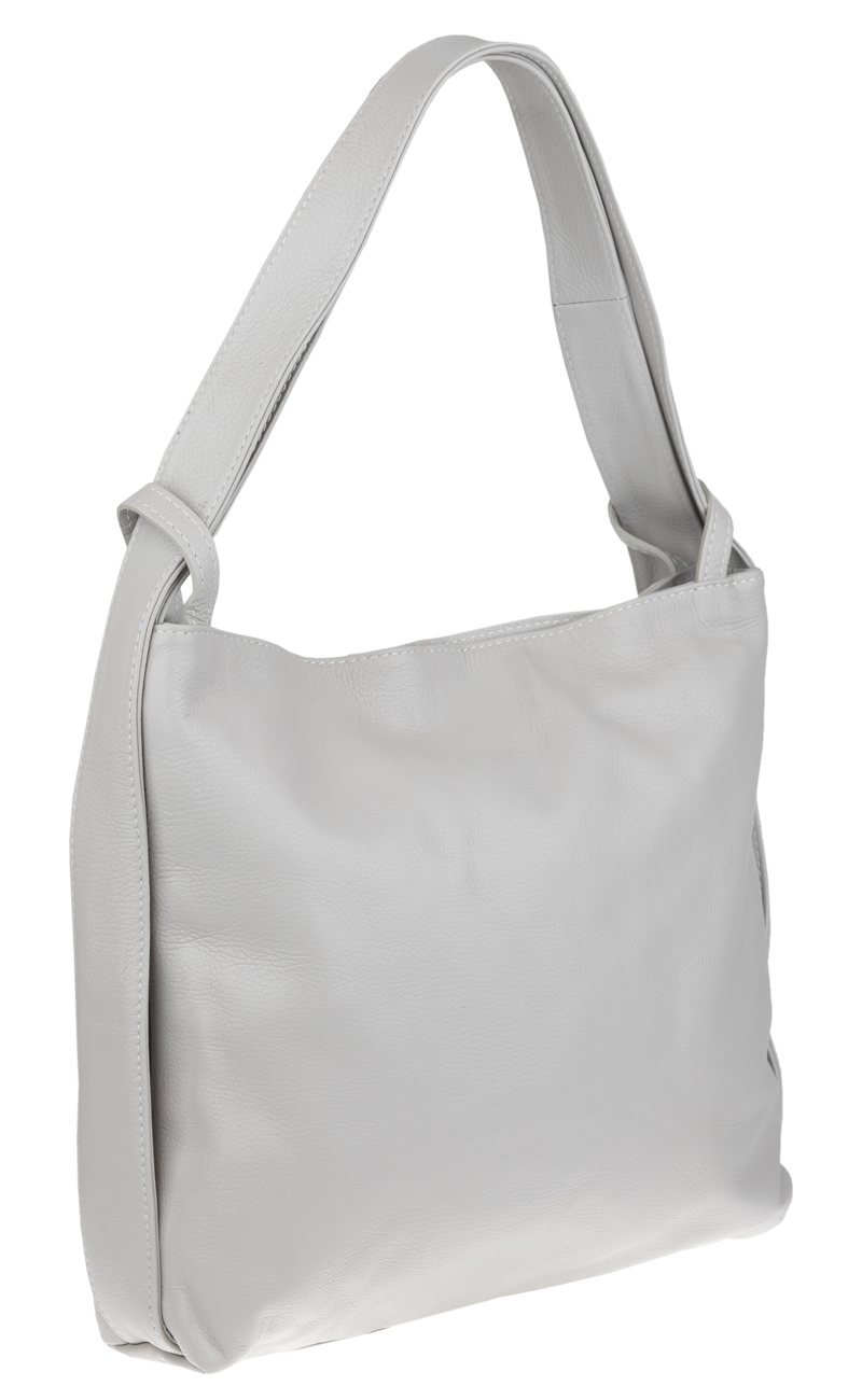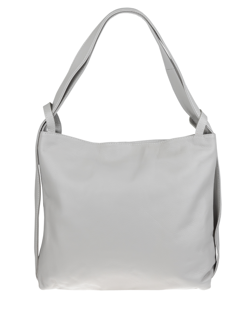 Krásná kožená kabelka s jednoduchým designem v šedé barvě. Tato kožená kabelka je uzavíratelná pomocí zipu. Disponuje pohodlnými uchy dostatečné délky, takže jí lze nosit  pohodlně přes rameno nebo jako batůžek. Pohodlně se do ní vejdou dokumenty formátu A4.