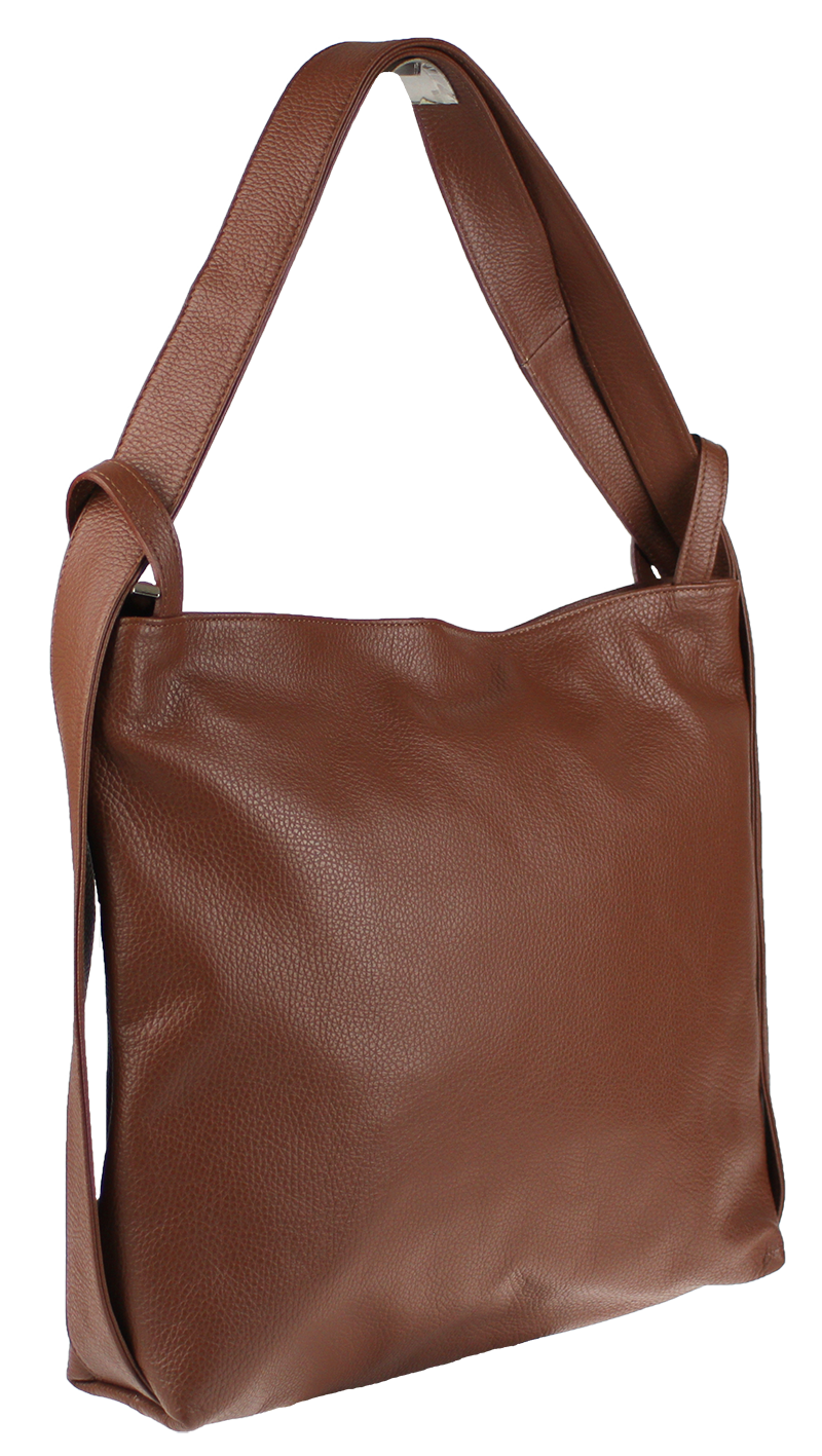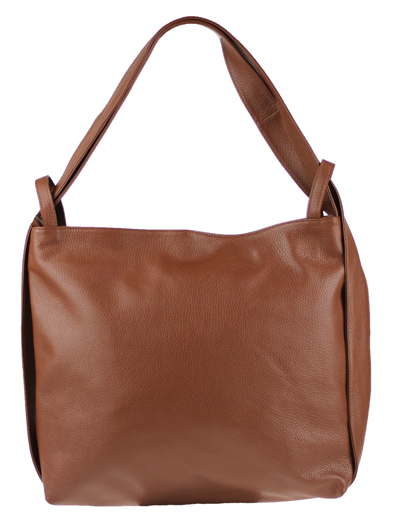 Krásná kožená kabelka s jednoduchým designem v hnědé barvě. Tato kožená kabelka je uzavíratelná pomocí zipu. Disponuje pohodlnými uchy dostatečné délky, takže jí lze nosit  pohodlně přes rameno nebo jako batůžek. Pohodlně se do ní vejdou dokumenty formátu A4.