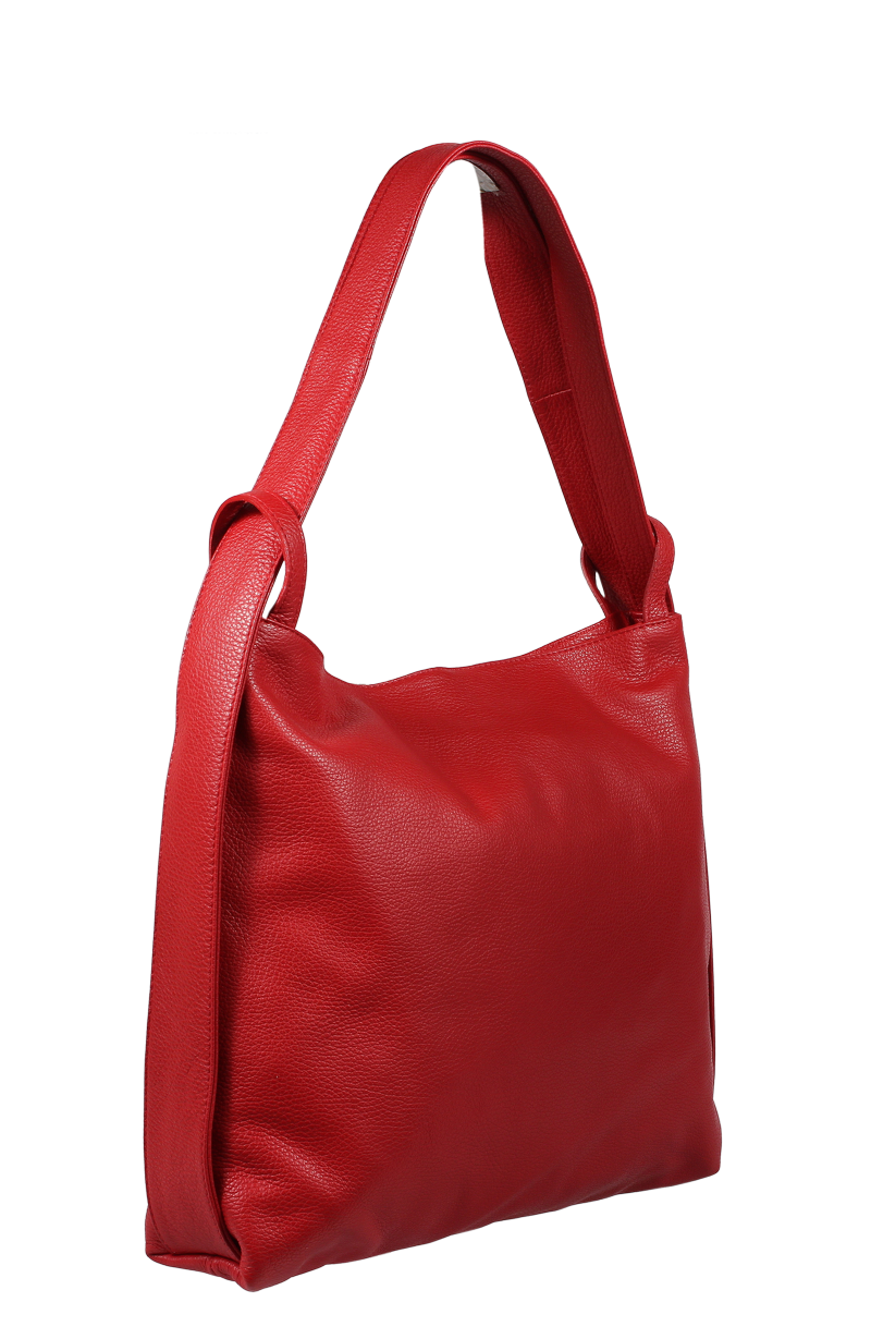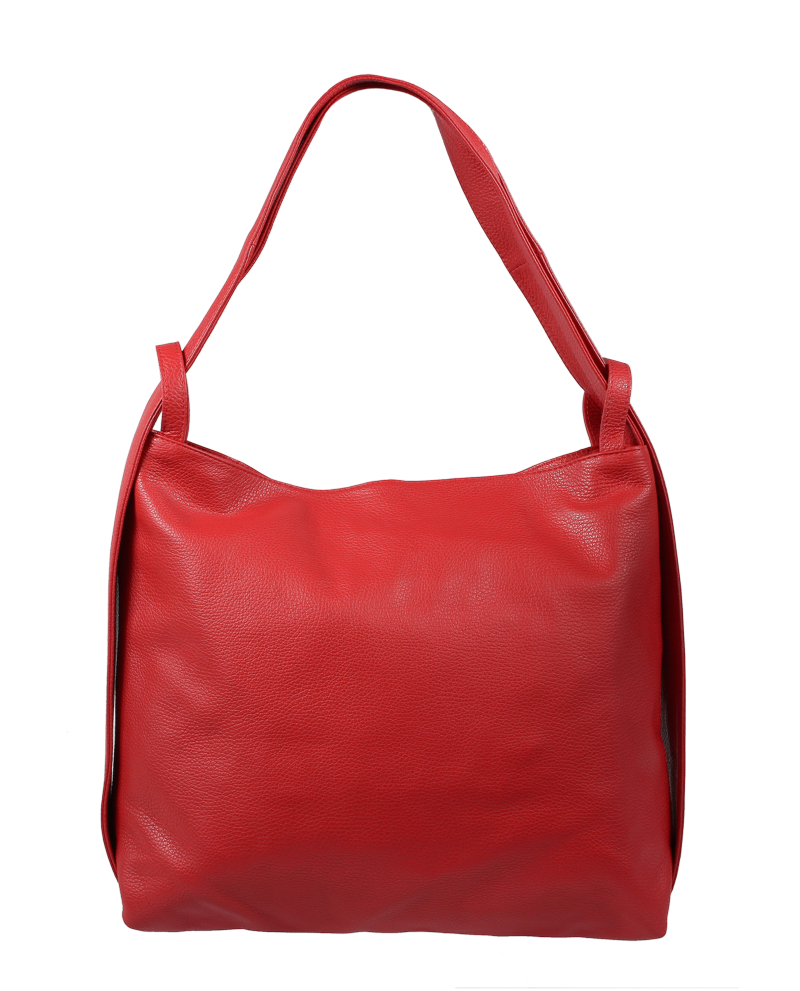 Krásná kožená kabelka s jednoduchým designem v červené barvě. Tato kožená kabelka je uzavíratelná pomocí zipu. Disponuje pohodlnými uchy dostatečné délky, takže jí lze nosit  pohodlně přes rameno nebo jako batůžek. Pohodlně se do ní vejdou dokumenty formátu A4.
