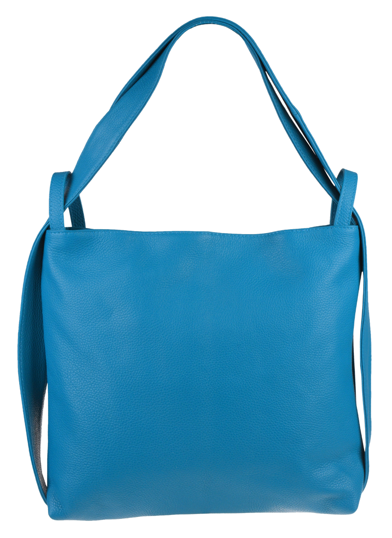 Krásná kožená kabelka s jednoduchým designem v modré barvě. Tato kožená kabelka je uzavíratelná pomocí zipu. Disponuje pohodlnými uchy dostatečné délky, takže jí lze nosit  pohodlně přes rameno nebo jako batůžek. Pohodlně se do ní vejdou dokumenty formátu A4.