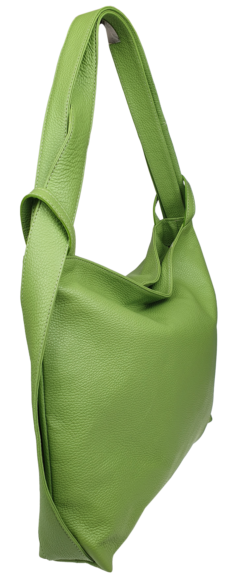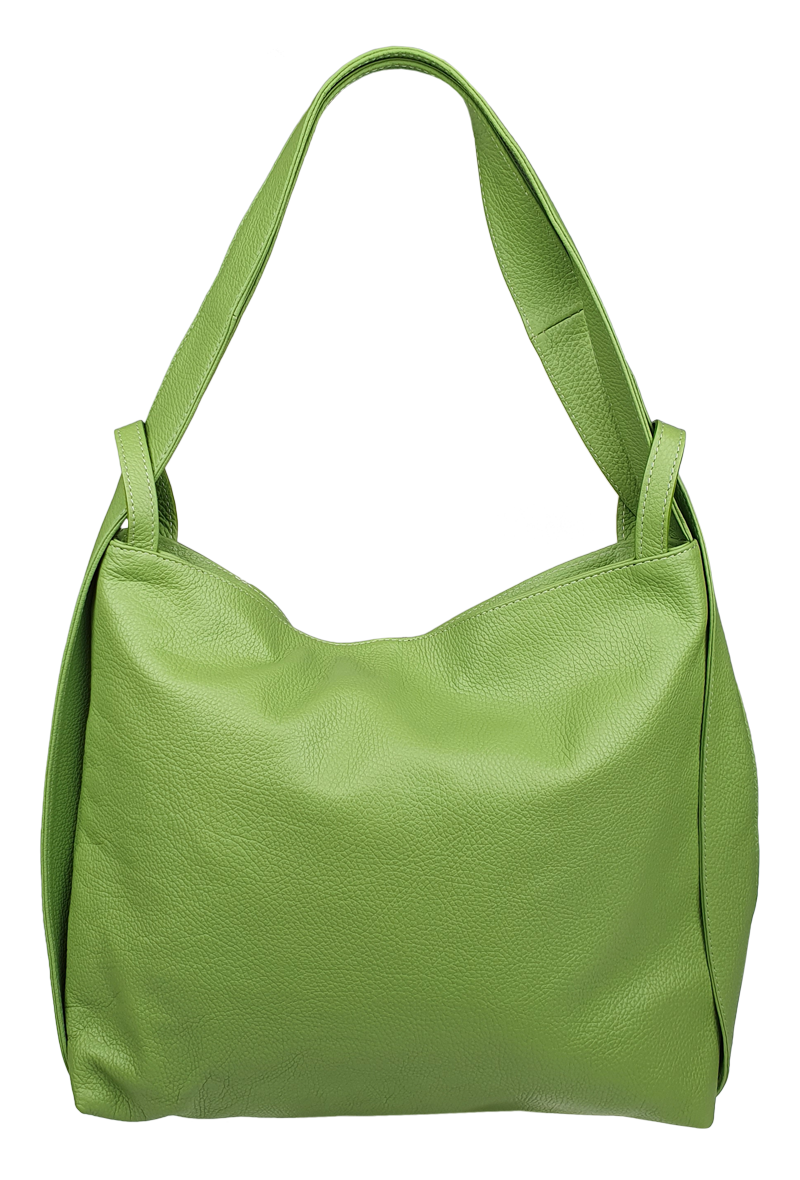 krásná kožená kabelka s jednoduchým designem v zelené barvě. Tato kožená kabelka je uzavíratelná pomocí zipu. Disponuje pohodlnými uchy dostatečné délky, takže jí lze nosit  pohodlně přes rameno nebo jako batůžek. Pohodlně se do ní vejdou dokumenty formátu A4.