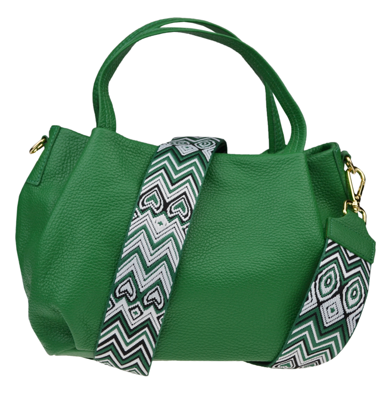 Elegantní a praktická zelená kabelka nositelná cross-body (křížem) nebo v ruce. Tato kožená kabelka je uzavíratelná na zip. Uvnitř kabelky najdeme na boční stěně  kapsu na zip a přihrádky pro mobil či klíče. Hloubka jejího dna je 13 cm.