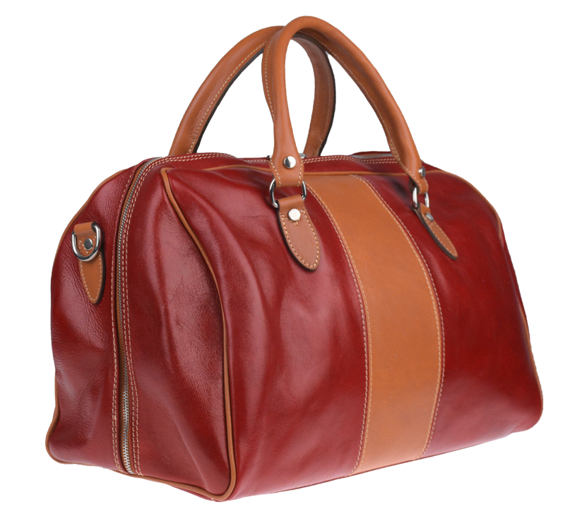 Luxusní kožená cestovní taška v červené barvě s camel doplňky. Taška je vyrobena z hladké kvalitní Italské kůže. Součástí tašky je přídavný popruh o délce cca 107cm. Taška se uzavírá kovovým zipem. Cestujte stylově s koženou taškou!