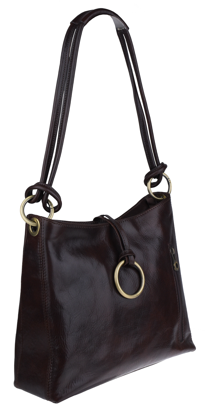 Tmavě hnědá středně velká kabelka klasického designu nositelná přes rameno. Na boku najdeme vertikální kapsu na zip. Tato kožená kabelka je uzavíratelní na zip a dále disponuje také ozdobou – kroužkem, který se překlápí přes zip a drží tak kabelku také zavřenou. Hloubka jejího dna je 9 cm.