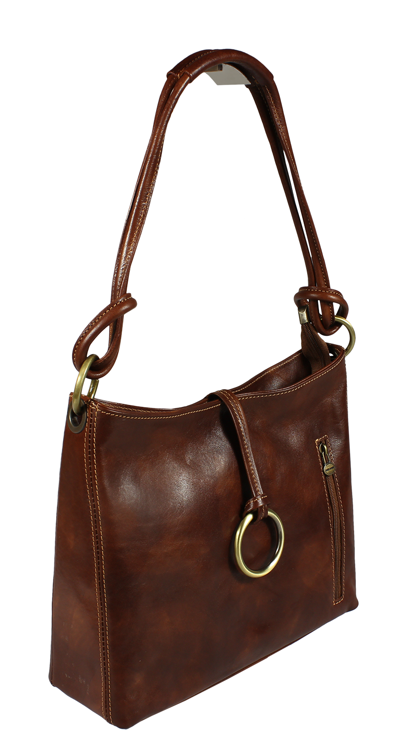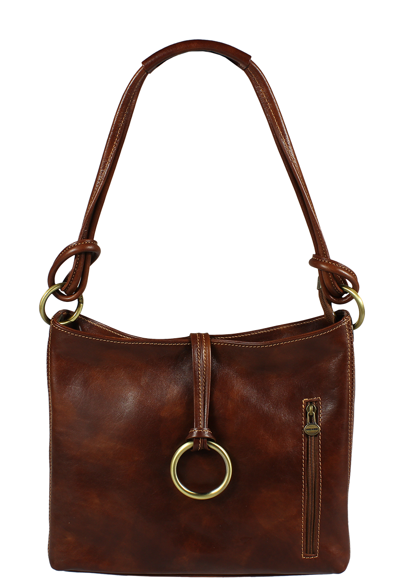 Hnědá středně velká kabelka klasického designu nositelná přes rameno. Na boku najdeme vertikální kapsu na zip. Tato kožená kabelka je uzavíratelní na zip a dále disponuje také ozdobou – kroužkem, který se překlápí přes zip a drží tak kabelku také zavřenou. Hloubka jejího dna je 9 cm.