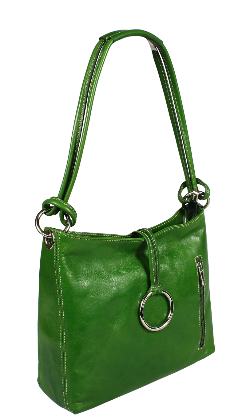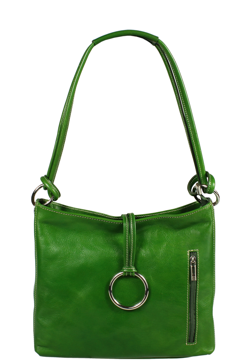 Zelená středně velká kabelka klasického designu nositelná přes rameno. Na boku najdeme vertikální kapsu na zip. Tato kožená kabelka je uzavíratelní na zip a dále disponuje také ozdobou – kroužkem, který se překlápí přes zip a drží tak kabelku také zavřenou. Hloubka jejího dna je 9 cm.