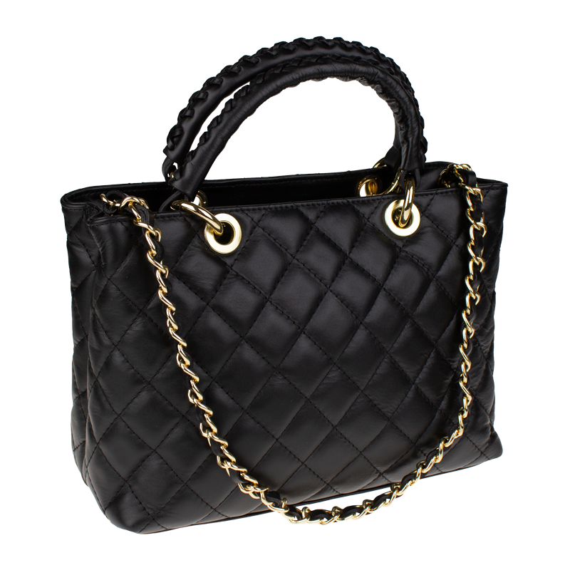 Kabelka je vybavena pevnými pletenými koženými uchy pro nošení v ruce a elegantním zlatým řetězem pro nošení přes rameno nebo crossbody. Kovové detaily ve zlatém tónu podtrhují luxusní vzhled.
